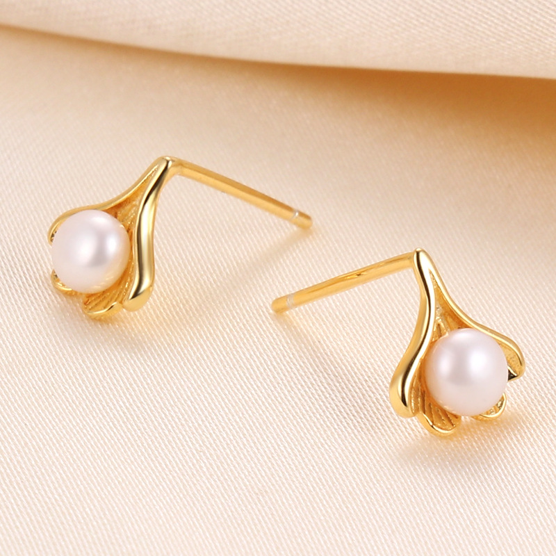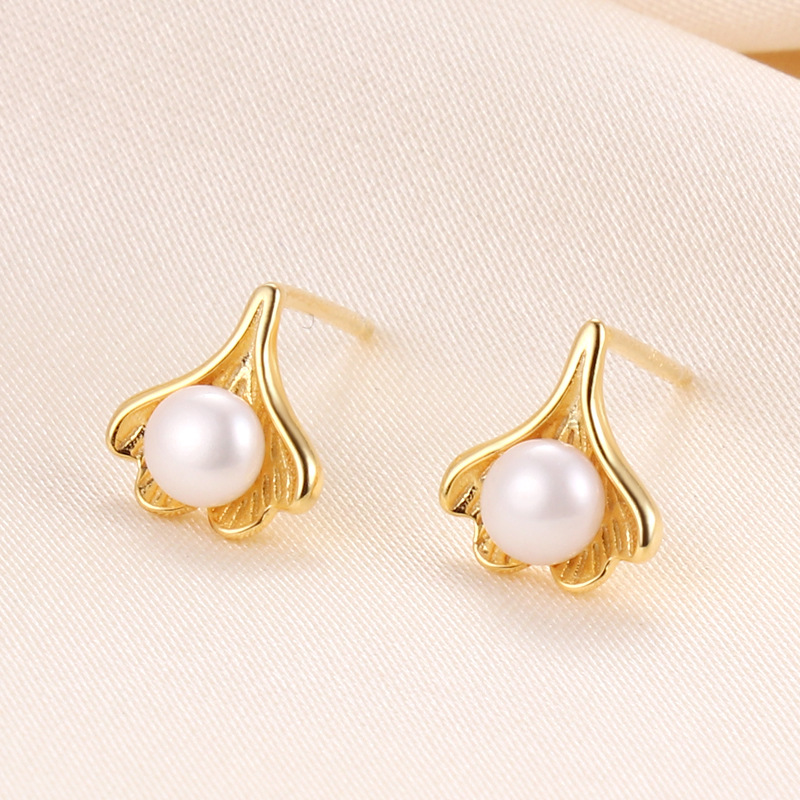 925 Sterling Silver ginkgo leaves with pink pearl stud earring
